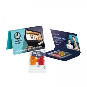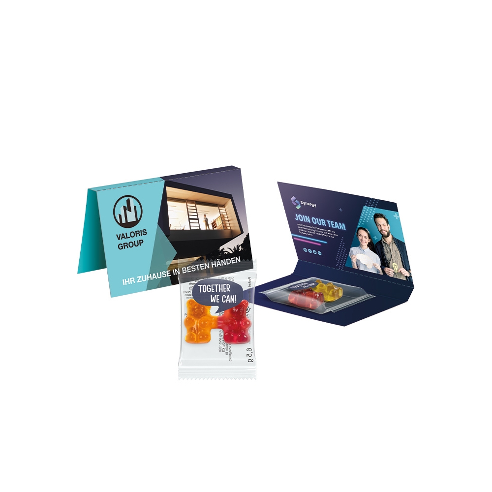 Artikel-Nr: PUC1191.00004Aufklappbarer Werbekarte aus weißem Karton mit praktischer Abreißperforation, individuell bedruckt. Inhalt: 1 Flowpack in Standardgestaltung (Motiv: together we can) mit 1 Trolli Team Gummibärchen in Premium Qualität mit 10 % Fruchtsaftanteil, bunt gemischt, 6,5 g,