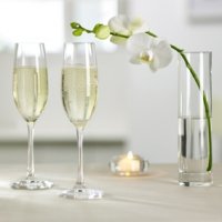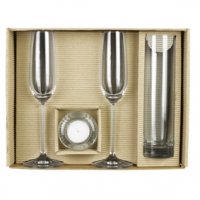 Prickelnd verführerische Kombination: 2 hochwertige Sektgläser (20 cl) kombiniert mit einem klaren Teelichthalter (inkl. Teelicht) und einer passenden Mini-Vase (Höhe ca. 20 cm, Ø ca. 4,9 cm).