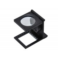 Klappbarer Fadenzähler aus schwarzem Metall mit Mikrolampe. Vergrösserungsfaktor 5. Skala in cm und Zoll. Lieferung mit Etui. 2 batterien CR927 inklusive.