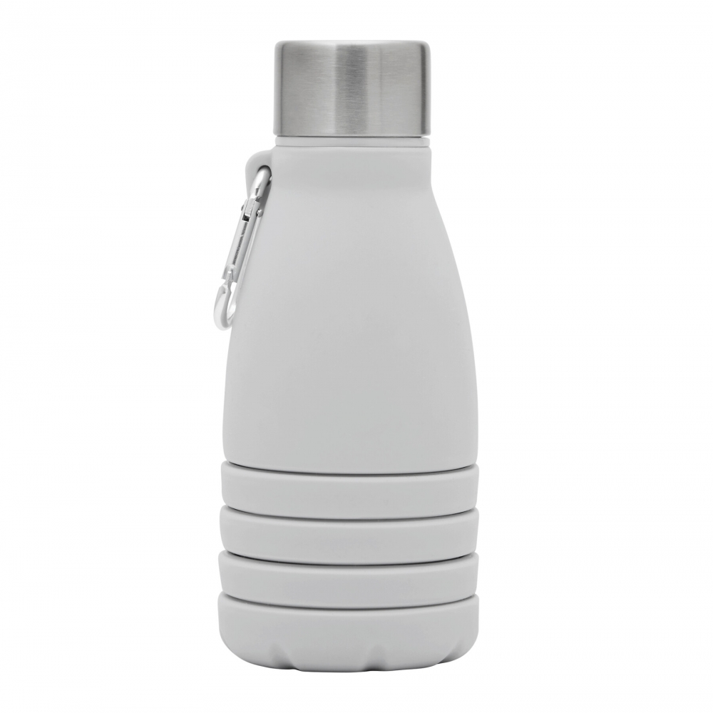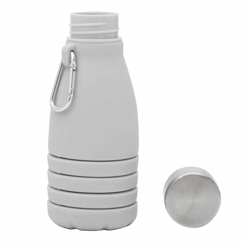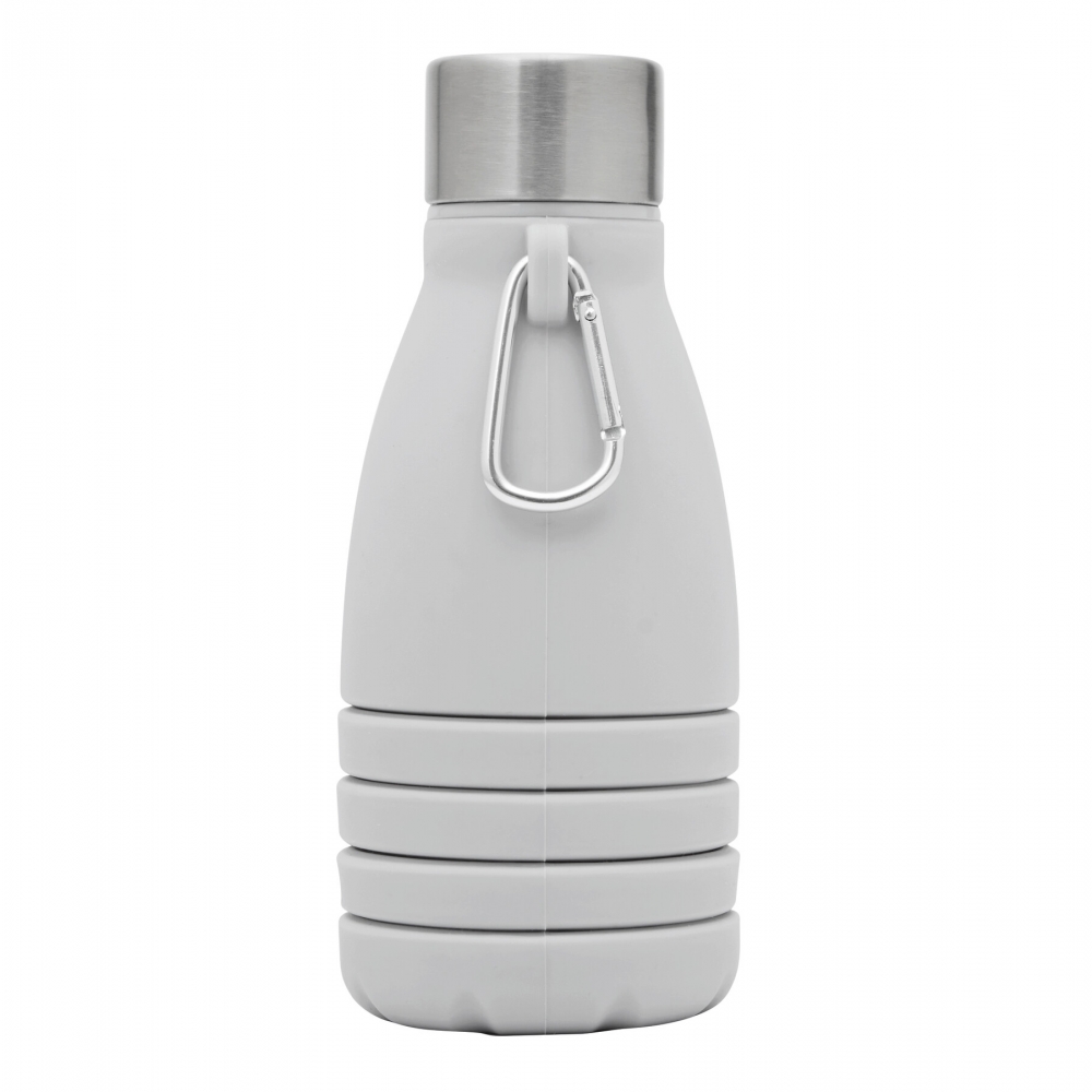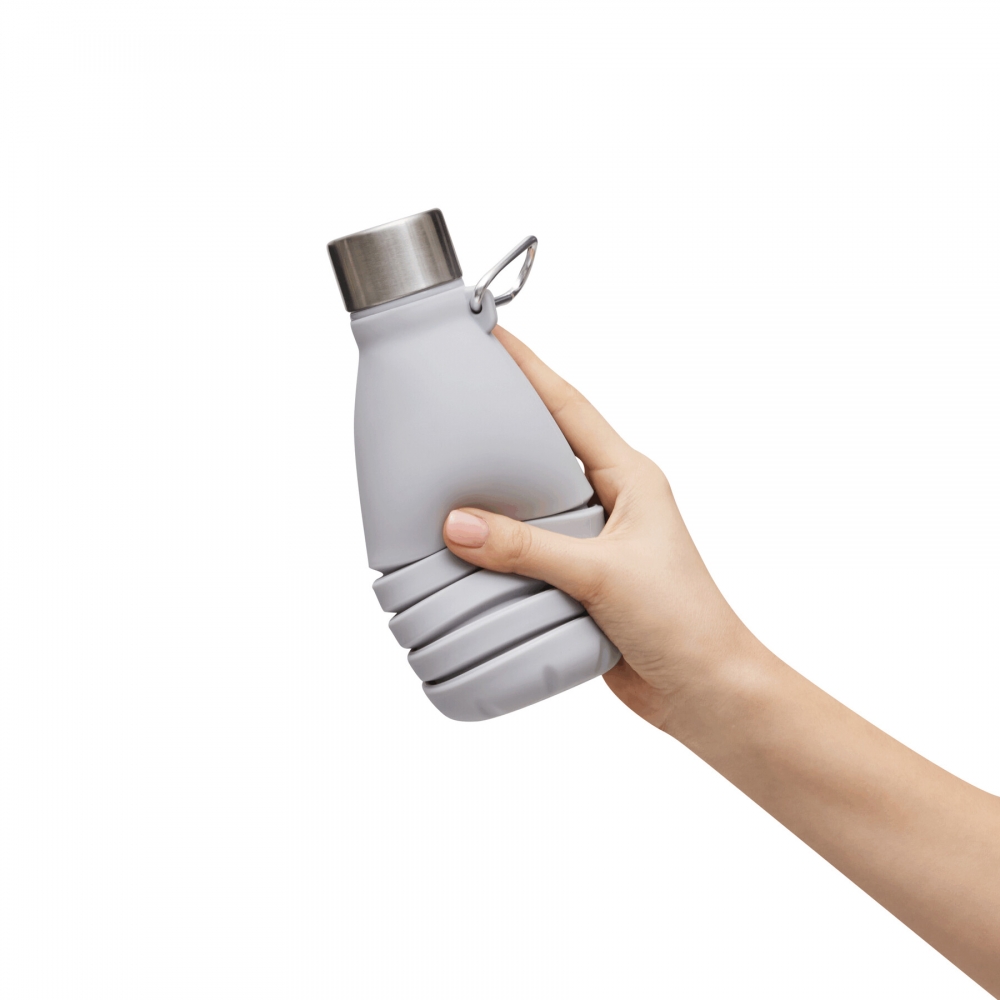 Artikel-Nr: INP56-0603193Faltbare Trinkflasche BIG GETS SMALL: aus Silikon, Edelstahl-Deckel mit sicherem Schraubverschluss und Silikon-Dichtring, mit Karabinerhaken (der Karabiner ist NICHT als Sicherung beim Klettern geeignet), die Flasche lässt sich um ca. 8 cm auseinanderziehen, Füllmenge ca. 550 ml, in Box