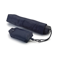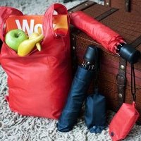 Regenschirm mit Schutzhülle, an dessen Handschlaufe mit Karabinerhaken eine faltbare Einkaufstasche befestigt ist.