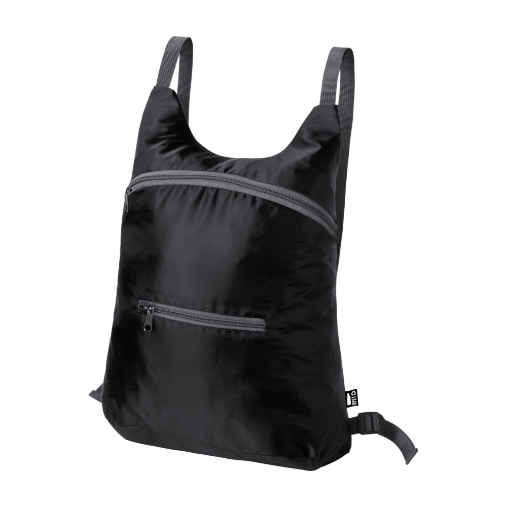 Artikel-Nr: AND722265-10Faltbarer RPET Rucksack mit Reißverschlussfächern und einstellbaren Schultergurten. Material: 210D RPET Polyester, mit RPET-Label.