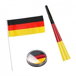 Artikel-Nr: ELT08487022-00000Dekorieren, schminken und anfeuern. In diesem Set ist alles drin, was man dafür benötigt und das gleich für elf Personen. Elf Deko-Fahnen "Stick" (08650), elf Tröten "Noisy" Deutschland (08657) und eine Fanschminke "Round" (08656) in Deutschlandfarben.