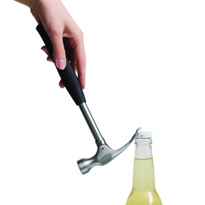 Artikel-Nr: INP56-0382016Feierabendhammer CLOCK OFF: Hammer auf der einen Seite und Flaschenöffner auf der anderen Seite, mit ergonomischem Kunststoff-Griff, in Box