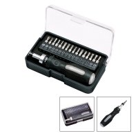 Artikel-Nr: 57383340SW-00Feinbit-Schraubendreher mit 16 Bits und Ratsche. Ideal für alle filigranen Feinarbeiten an Uhr, Brille, PC usw. Alle Bits sind aus CRV-Stahl 6150 Rockwell 54° gefertigt: 3x Phillips (PH00 / PH0 / PH1), 3x Schlitz (2,0 / 2,5 / 3,0 mm), 5x Torx (T6 / T7 / T8 / T9 / T10), 3x Inbus (H1,5 / H2 / H2,5), 2x Pozidriv (PZ00 / PZ0). Der Schraubendreher ist mit einer Ratsche ausgestattet und die magnetische Bitaufnahme fixiert komfortabel das Bit.