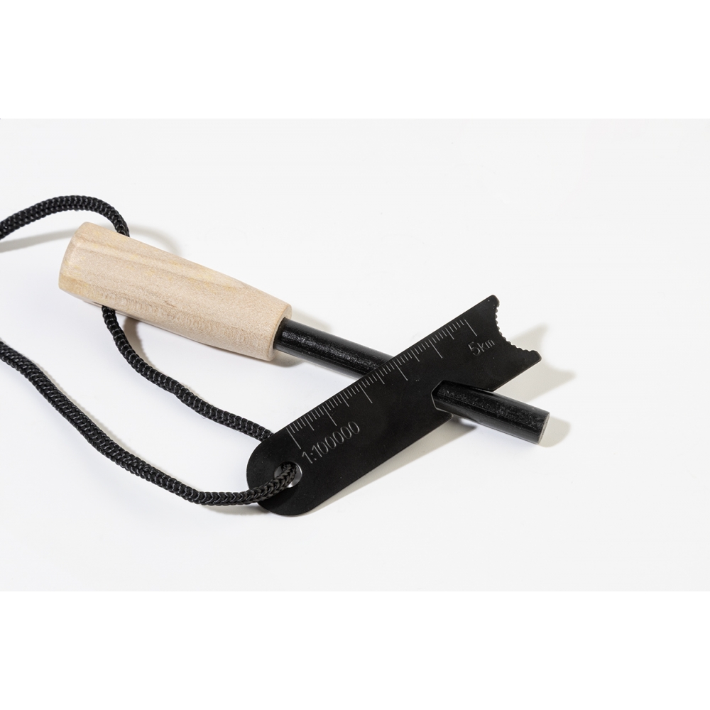 Artikel-Nr: AND800799Überlebens-Feuerstarter-Werkzeug mit Holzgriff und multifunktionalem Edelstahlschaber, ausgestattet mit Lineal, Flaschenöffner und Inbusschlüssel.