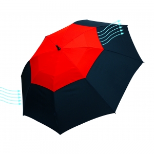 Artikel-Nr: INP56-0104172Fiberglas-Golfschirm MONSUN mit Ventilationssystem: Fiberglasstock und -speichen, Kunststofftips, Kunststoffgriff, Nylon-Bespannung, Schließband mit Klettverschluss