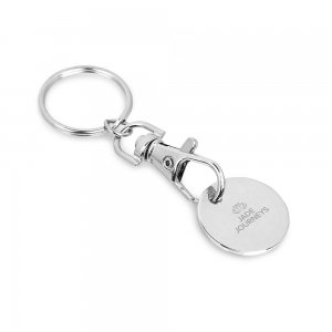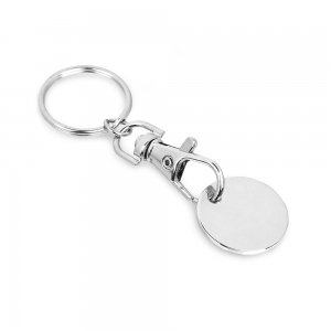 Artikel-Nr: PST93089-107Schlüsselanhänger aus Metall mit Einkaufschip. Ring: ø 25 mm | Produkt: ø 23 mm | Verbinder: 9 mm | Karabinerhaken: 35 x 16 mm | Gesamt: 80 x 25 x 2 mm
