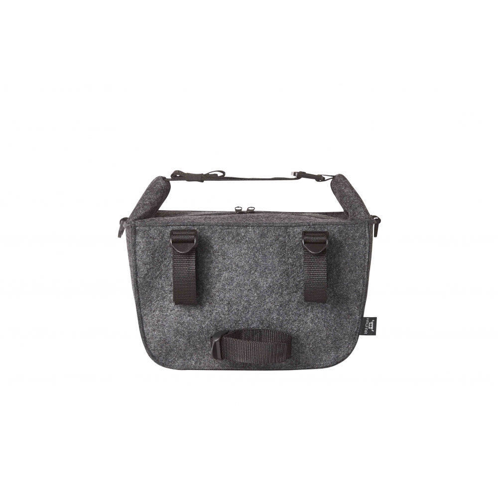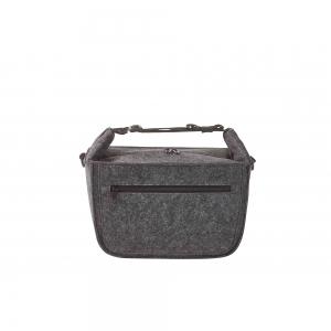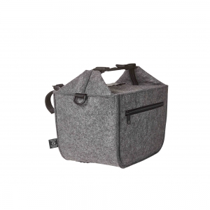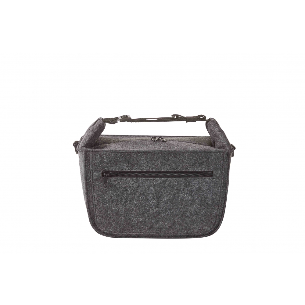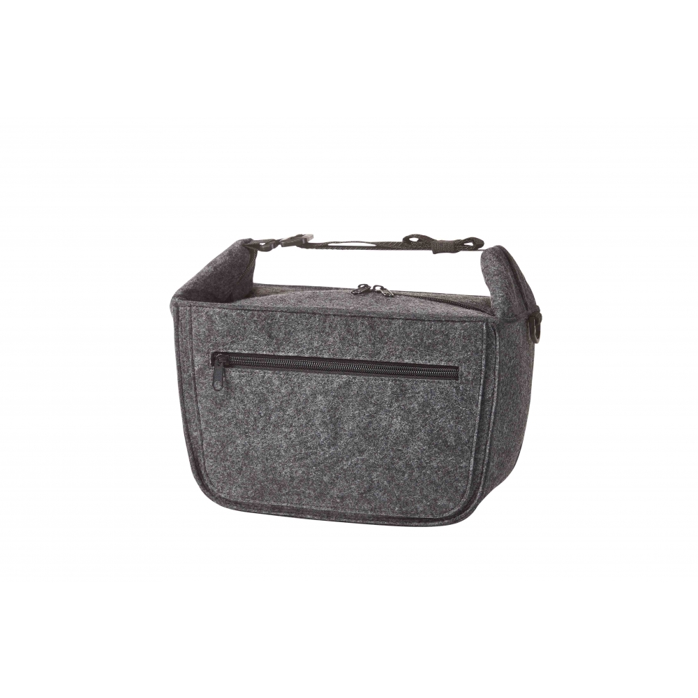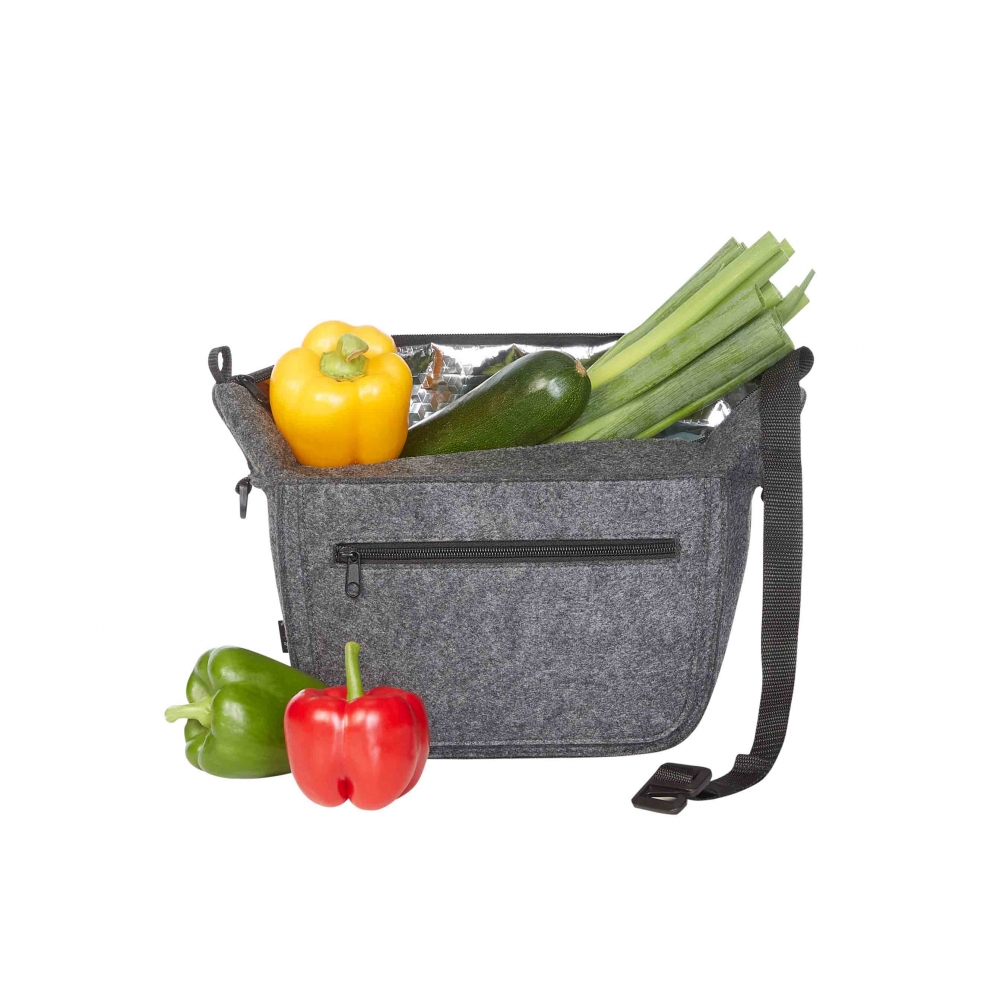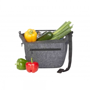 Artikel-Nr: HLF1818050-10Zeitlose Filzkühltasche; Hauptfach mit 2-Wege-Reißverschluss; großzügige Polsterung; innen abwaschbar; einseitig lösbarer, längenverstellbarer Träger mit G-Hook und Gummilasche zur Gurtfixierung; beidseitig D-Ringe zu Befestigung z. B.: für optionalen Schultergurt* oder Schlüssel; Bodenfüße; rückseitig Schlaufen zur Befestigung am Fahrradlenker