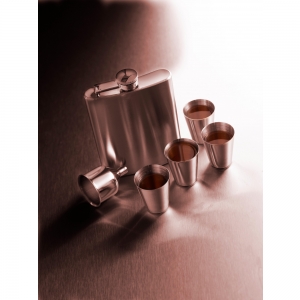 Artikel-Nr: GIV2807032Flachmann Set aus Edelstahl, 6-tlg., bestehend aus einem Flachmann (220 ml), 4 Bechern (à 30 ml) und einem Trichter.
