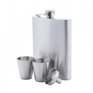 Artikel-Nr: AND845180Flachmann aus Edelstahl mit 2 Trinkbechern und einem Trichter. Füllmenge: 230 ml. Verpackt in schwarzer Geschenkbox.