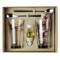2 Latte Macchiato-Gläser mit Dekor im Set mit 2 Edelstahllöffeln und 1 Fläschen Vanille-Sirup (50 ml) zum Aromatisieren Ihres Latte Macchiatos. Inklusive Rezeptblatt.