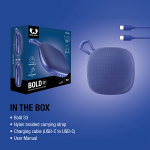 Artikel-Nr: ART49741N0011Der Bold S3 ist der perfekte tragbare Lautsprecher mit IPX6-Wasserdichtigkeit, bis zu 15 h Akkulaufzeit und der Möglichkeit, zwei Geräte drahtlos zu koppeln. Der 5-W-Lautsprecher liefert beeindruckenden Klang trotz kompakter Größe.
