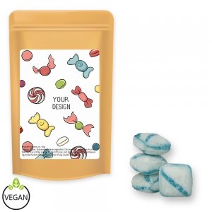 Artikel-Nr: FNM02435Standbeutel Midi aus Kraftpapier. Werbeanbringung als Etikett in 4c individuell bedruckbar. Zutaten Frische Brise Bonbons: Zucker, Glukosesirup, Pfefferminzöl, Menthol, Farbstoff: E132