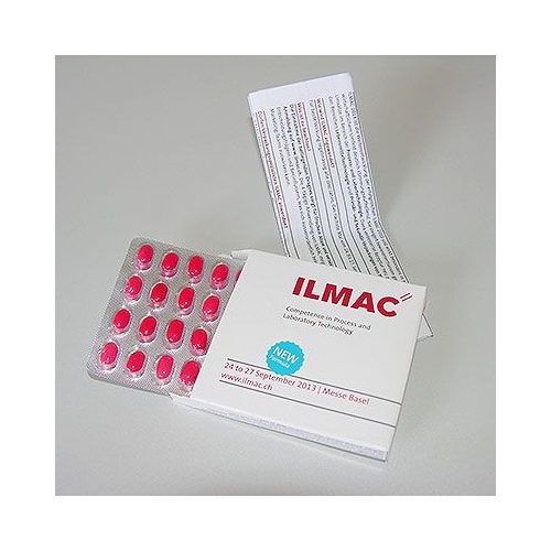 Artikel-Nr: WTabletten_SuessigkeiDie Pillen schmecken süß und sind absolut ungefährlich! Die leckeren Fruchtdragees sehen lediglich aus, wie echte Tabletten. Die Karton-Umverpackung wird komplett bedruckt, der Blister kann ebenfalls von der Rückseite einfarbig bedruckt werden und Sie haben noch zusätzlich Werbefläche auf einem Beipackzettel, den Sie mit Ihren Werbeinhalten bedrucken lassen können.