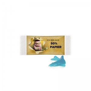 Artikel-Nr: PUC1127.00010Flowpack aus weißer Folie mit 50% Papieranteil, individuell bedruckt. Inhalt: 1 Trolli Fruchtgummi "Haifisch" blau, mit weißem Schaumzuckerbauch, 8g, Sonderfarben und -geschmacksrichtungen ab 50.000 Stück auf Anfrage