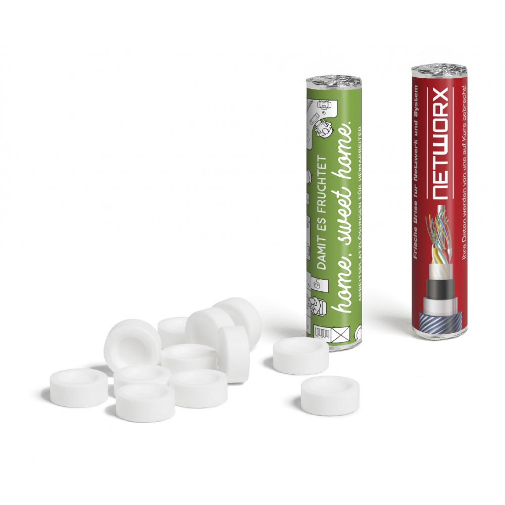 Artikel-Nr: MGN03010-0008fruchtige oder erfrischende Pfefferminztabletten (zuckerhaltig), handlich verpackt in einer individuell bedruckbaren Papierbanderole.