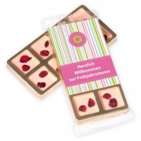 Artikel-Nr: 49450133Versüßen Sie Ihren Kunden den Start in den Frühling! Weiße Schokolade, Erdbeeraromen und als Krönung leicht säuerliche, getrocknete Cranberries, das Ganze in acht praktische Mini-Täfelchen geteilt und mit einem individualisierten Aufkleber ansprechend in einem goldfarbenen Blister verpackt – fertig ist das perfekte Frühjahrspräsent.