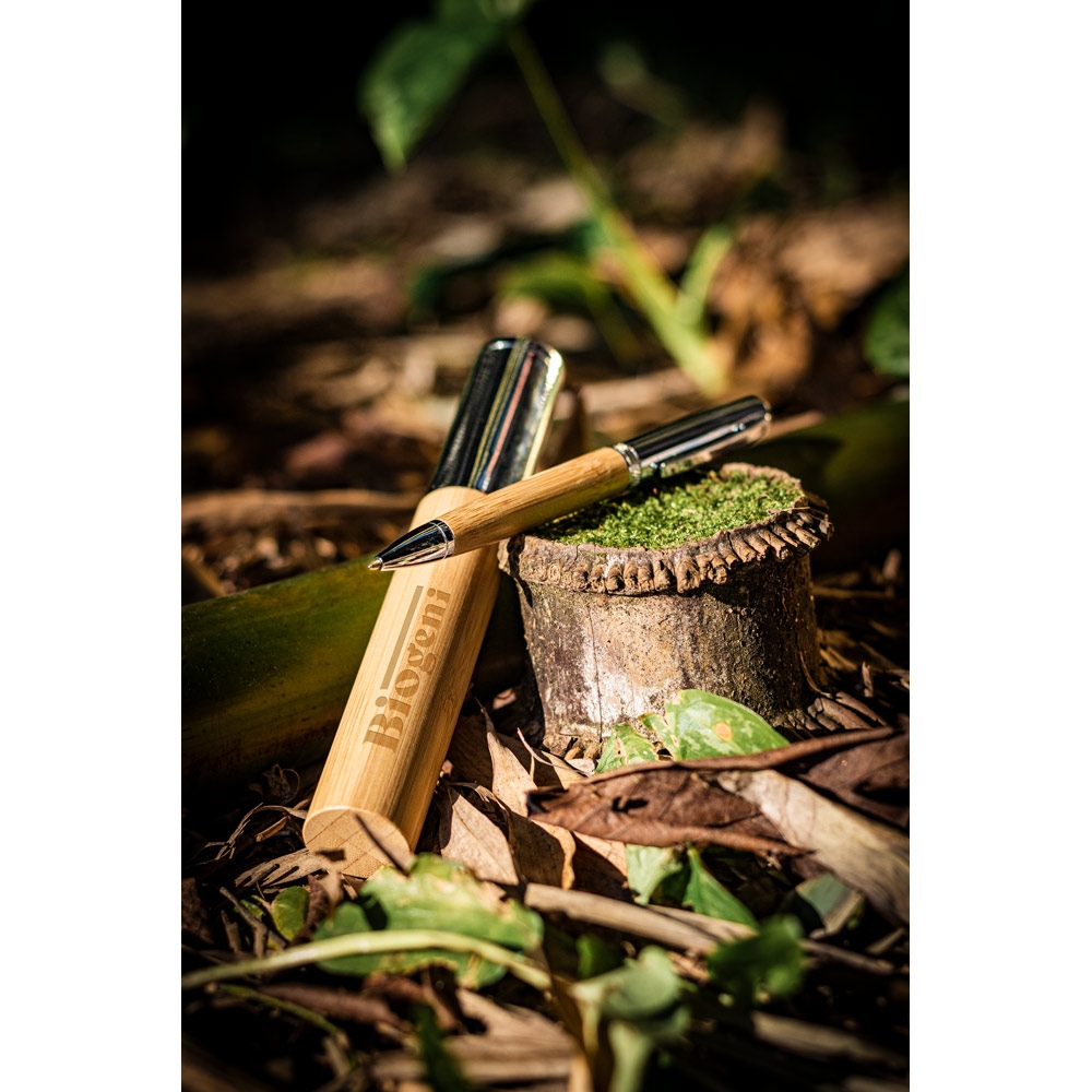 Artikel-Nr: PST91775-160Kugelschreiber aus Bambus und Aluminium mit einer metallischen matten Oberfläche. Drehmechanismus und Clip aus Metal. Blauschreibende Mine. Geliefert in einem Geschenketui aus Kraftpapier. Da das Produkt aus natürlichen Materialien hergestellt wird, können Farbe des Produkts sowie das Druckergebnis von Produkt zu Produkt unterschiedlich sein. Kugelschreiber: Ø12 x 136mm | Schachtel: 23 x 155 mm