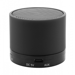 Artikel-Nr: AND864111-10Kabelloser Lautsprecher aus recyceltem ABS in gummiertem Gehäuse mit Metallgitter und wiederaufladbarem Akku (300 mAh). Mit Freisprechfunktion und MP3-Wiedergabe über Micro-SD-Karte. Inklusive USB-Ladekabel.