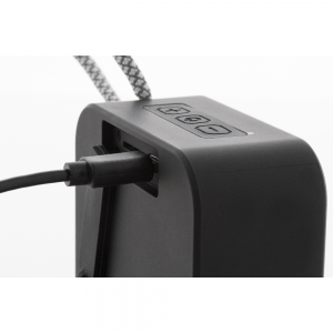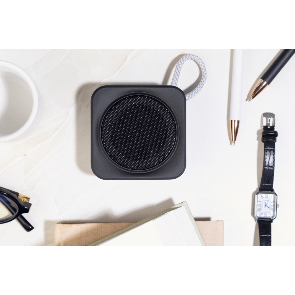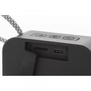 Artikel-Nr: AND864109-10Kabelloser Lautsprecher aus recyceltem ABS mit Trageschlaufe, Metallgitter und wiederaufladbarem Akku (300 mAh). Mit Micro-SD-Funktion zur MP3-Wiedergabe. Inklusive USB-Ladekabel.