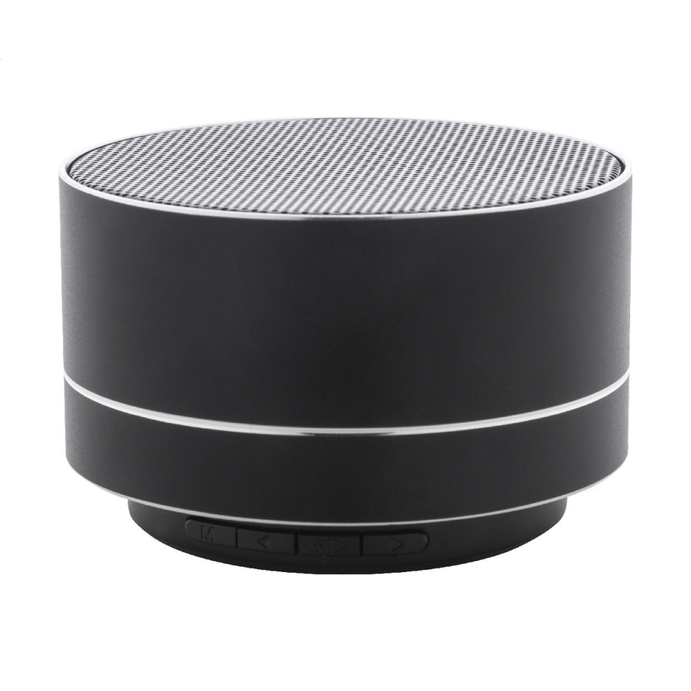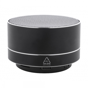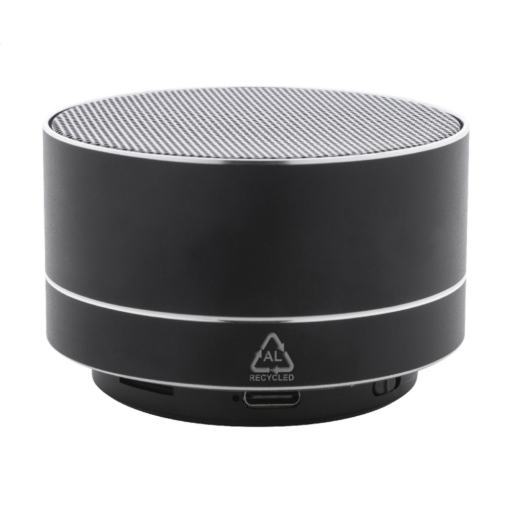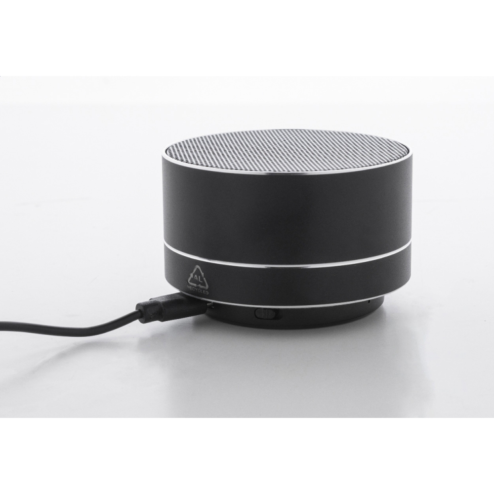 Artikel-Nr: AND864112-10Kabelloser Lautsprecher aus recyceltem Aluminium mit Metallgitter, LED-Leuchten an der Unterseite und wiederaufladbarem Akku (300 mAh). Mit Freisprechfunktion und MP3-Wiedergabe über Micro-SD-Karte. Inklusive USB-Ladekabel.