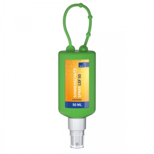 Praktische Kosmetikflasche zum Anhängen! Das Spray mit Silikonhülle ist nicht nur optisch ein echter Hingucker! Raffiniert mit Schlaufe zum an de Strandtasche, den Wander-Rucksack, den Ski-Anorak oder an den Kinderwagen. 50 ml PET Flasche (weiß) mit weißem Pumpaufsatz und transparenter Schutzkappe; Silikonhülle und Schlaufe in Nachfüllbar. Flasche hergestellt aus 100% recyceltem PET, weiß mit leichter R-PET-Färbung. Sonnenschutz-Spray mit LSF 50: Das transparente Sonnenschutz-Spray wirkt sofort, zieht schnell ein, klebt nicht und hinterlässt keine sichtbaren Rückstände auf der Haut. Die wasserfeste Fo ...