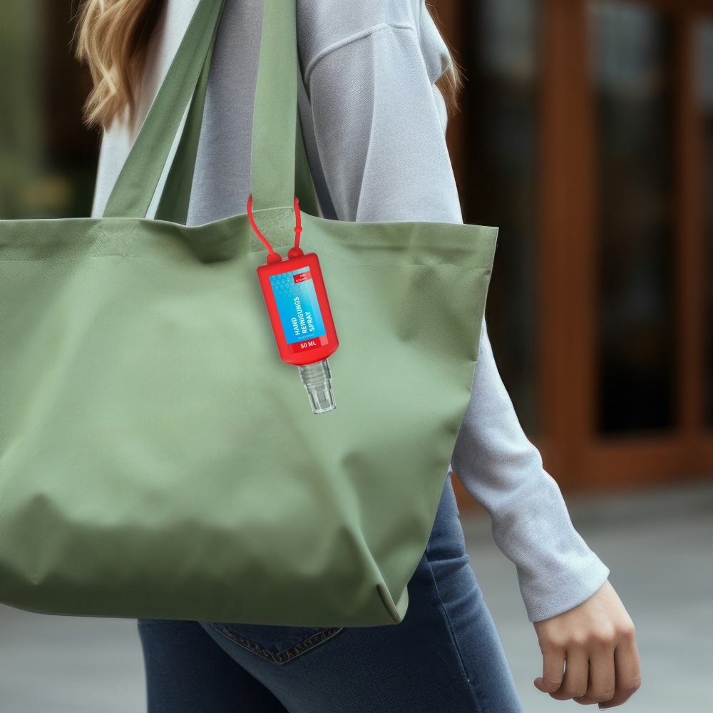 Praktische Flasche zum Anhängen! Das Fläschchen mit Silikonhülle ist nicht nur optisch ein echter, Raffiniert mit Schlaufe zum Anhängen ans Handgepäck, an den Rucksack oder an den Kinderwagen. 50 ml Flasche aus 100% recyceltem PET, transparent mit leichter mit Pumpaufsatz "transparent" mit Schutzkappe; Silikonhülle und Schlaufe in Nachfüllbar. Dekoration: Body Label: Etikett PE (weiß) auf Vorder- und Rückseite, Druck 4c CMYK. Wahlweise glänzend oder matt. Das alkoholische Hände-Desinfektionsspmittel verfügt aufgrund seiner Zusammensetzung über ein breites Wirkspekt ...