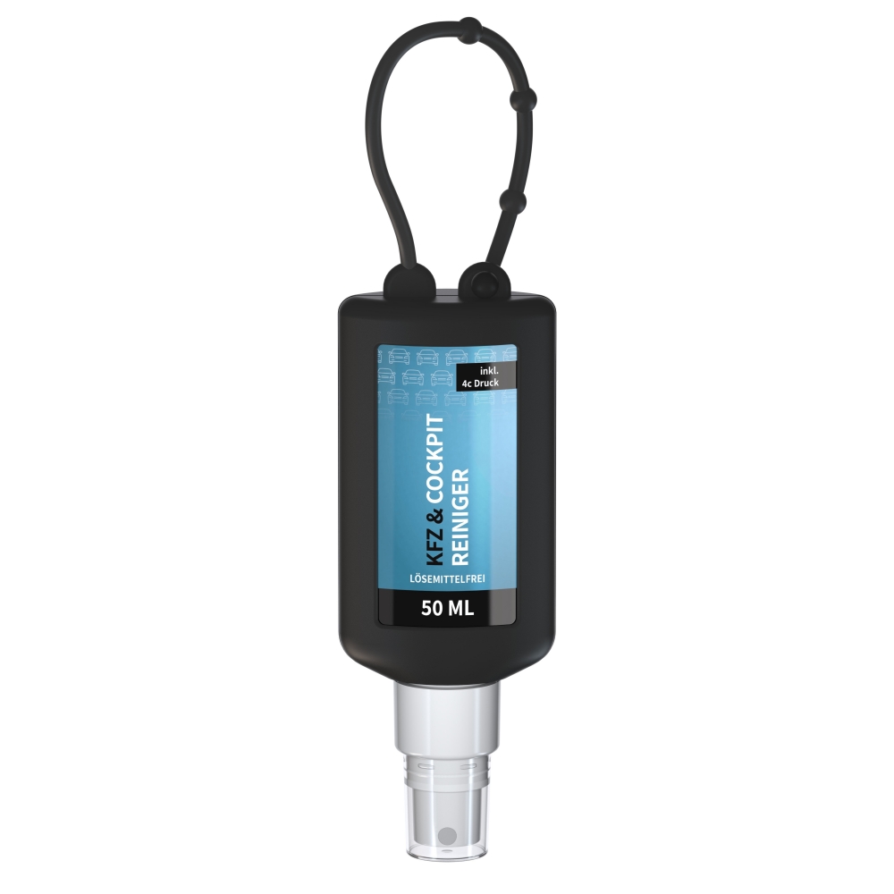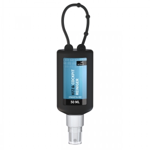 Praktische Kosmetikflasche zum Anhängen! Das Spray mit Silikonhülle ist nicht nur optisch ein echter Hingucker! Raffiniert mit Schlaufe zum Anhängen an de Strandtasche, den Wander-Rucksack, den Ski-Anorak oder an den Kinderwagen. 50 ml PET Flasche (weiß) mit weißem Pumpaufsatz und transparenter Schutzkappe; Silikonhülle und Schlaufe in Nachfüllbar. Flasche hergestellt aus 100% recyceltem PET, weiß mit leichter R-PET-Färbung. Das Reinigungsspray entfernt Verschmutzungen materialschonend. Es ist bestens geeignet für die schnelle und unkomplizierte Reinigung des gesamten Kfz Cockpits, insbesondere von Displays un ...