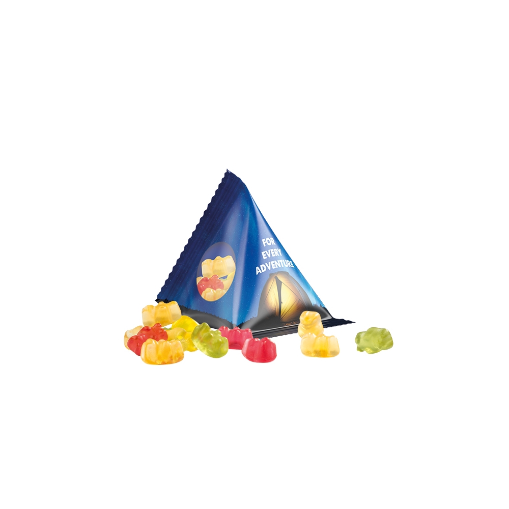 Trolli Fruchtgummi im Tetraeder aus transparenter Folie, individuell bedruckt. Inhalt: Trolli Fruchtgummi Bärchen in Premium Qualität mit 10 % Fruchtsaftanteil, bunt gemischt, 15 g