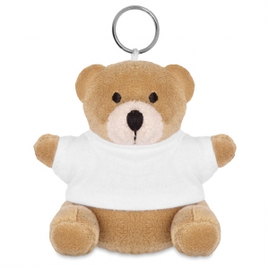 Schlüsselring mit Teddy-Bär. Der Bär trägt ein T-Shirt aus 100% Baumwolle. Ideal zum Veredeln.