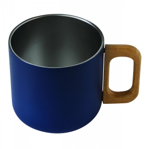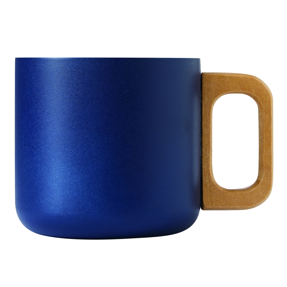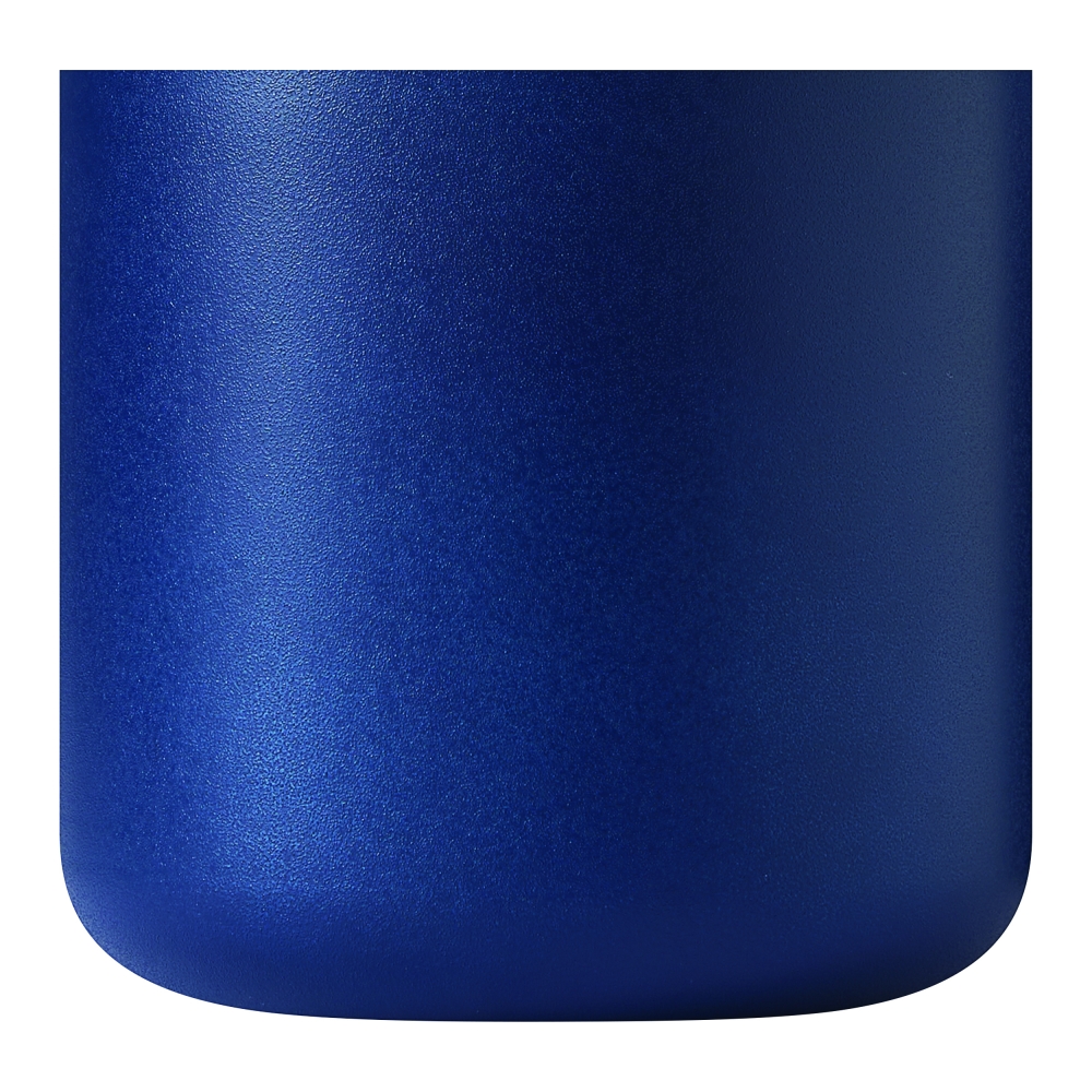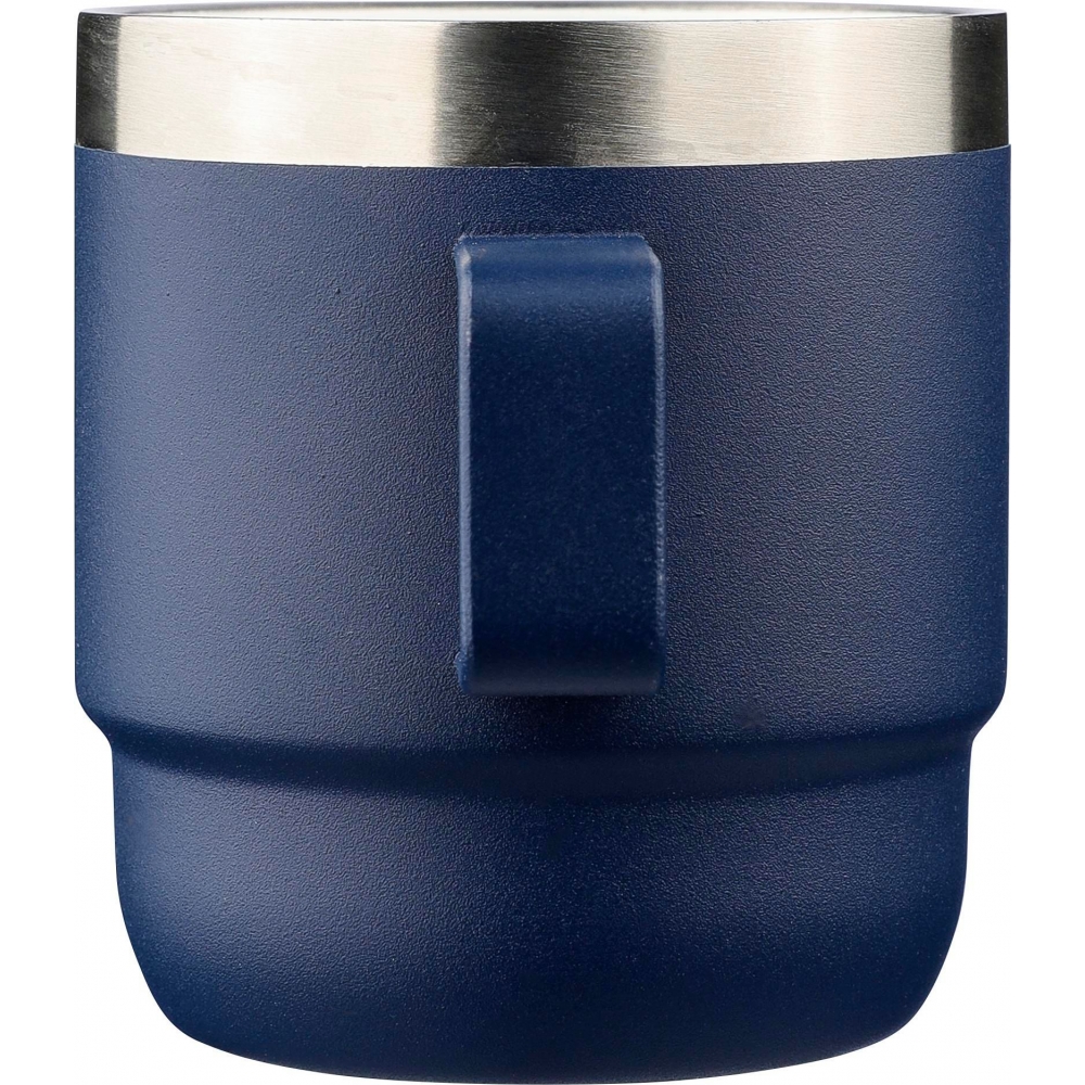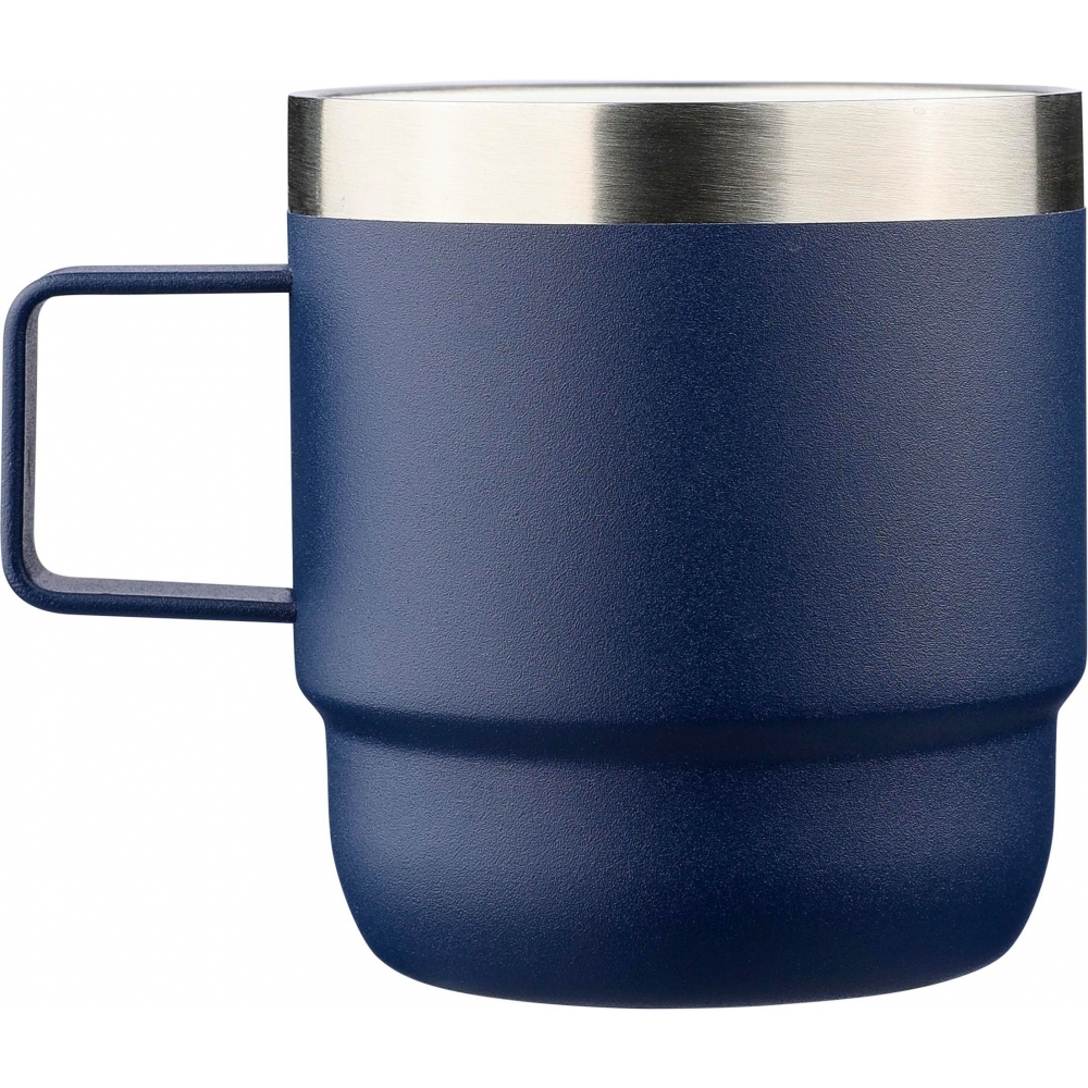 0,35l Edelstahlbecher, doppelwandig isoliert, mit Kunststoffapplikationen, Deckel und Griff aus Kunststoff, in blau. Maße: 8,8 x 12,4 x 14,6 - Ø 8,8 mm. Erhältliche Farben: Blau, Rot und Grau
