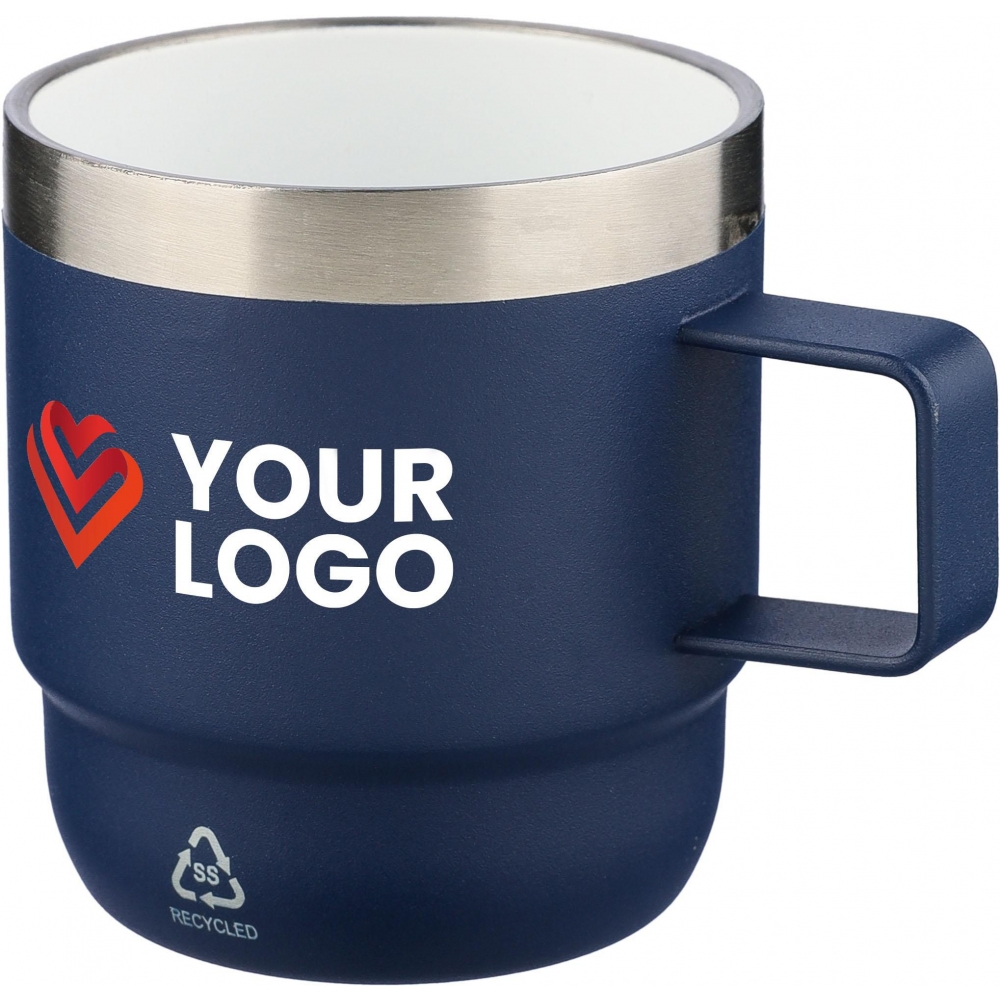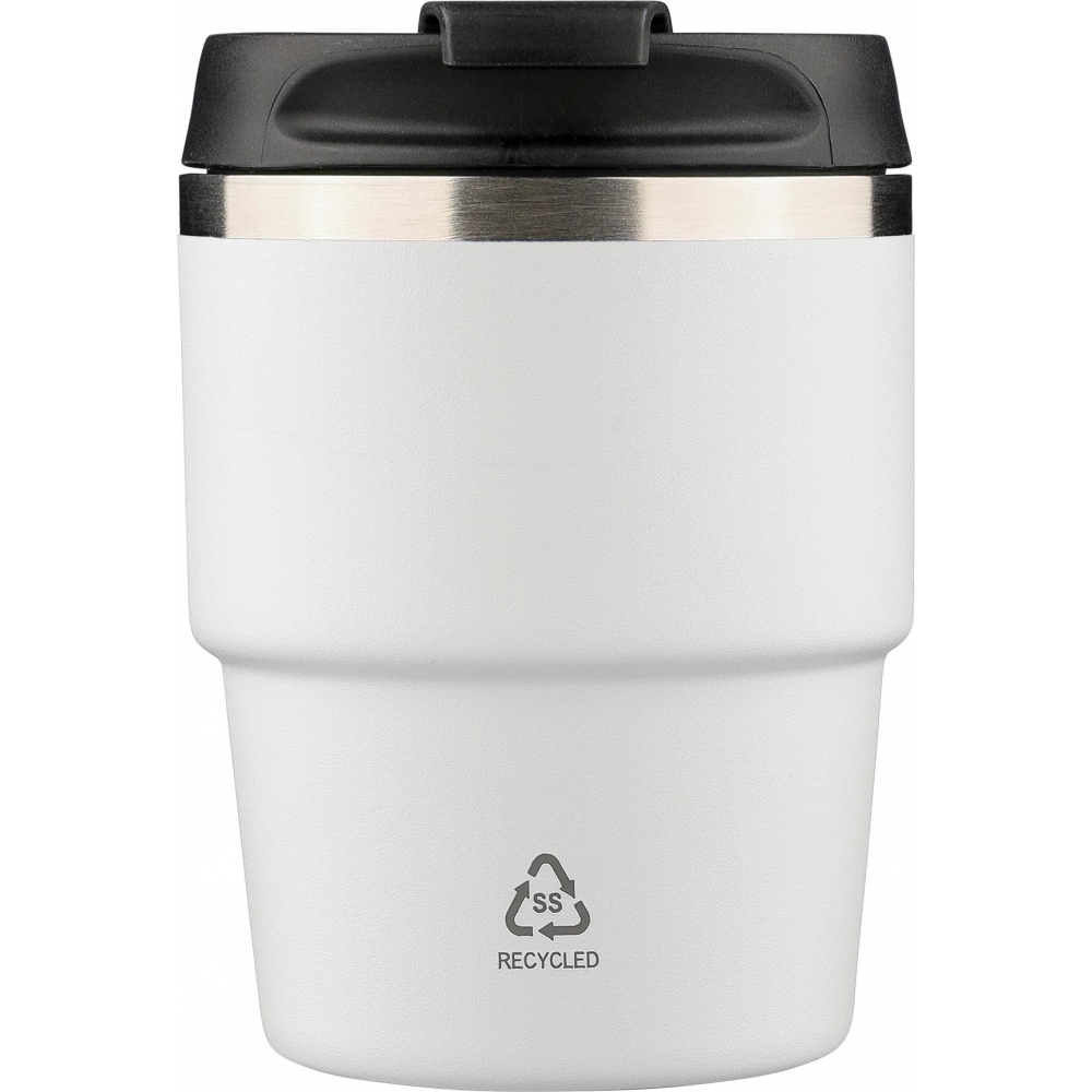 Becher aus recyceltem Edelstahl (18 ml) mit doppelwandiger Konstruktion. Innen aus Edelstahl 304 und außen aus Edelstahl 201. Die Keramikbeschichtung im Inneren sorgt für verbesserte Hygiene und reduzierte Geschmacks- und Geruchsübertragung. Mit Henkel und lasergraviertem Recycling-Logo auf der Vorderseite. Einzeln verpackt in einem braunen Karton.