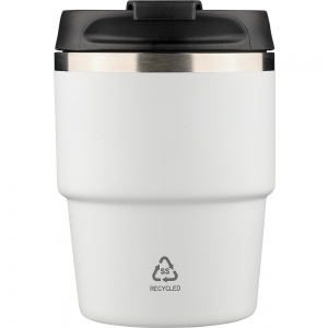 Doppelwandiger Isolierbecher (175 ml) aus recyceltem Edelstahl mit Innenmaterial aus Edelstahl 304 und Außenmaterial aus Edelstahl 201. Pulverbeschichtet und mit PP-Schraubdeckel. Kompakte Größe, passt unter die meisten Kaffeemaschinen. Mit lasergraviertem Recycling-Logo auf der Vorderseite. Einzeln verpackt in einem braunen Karton.