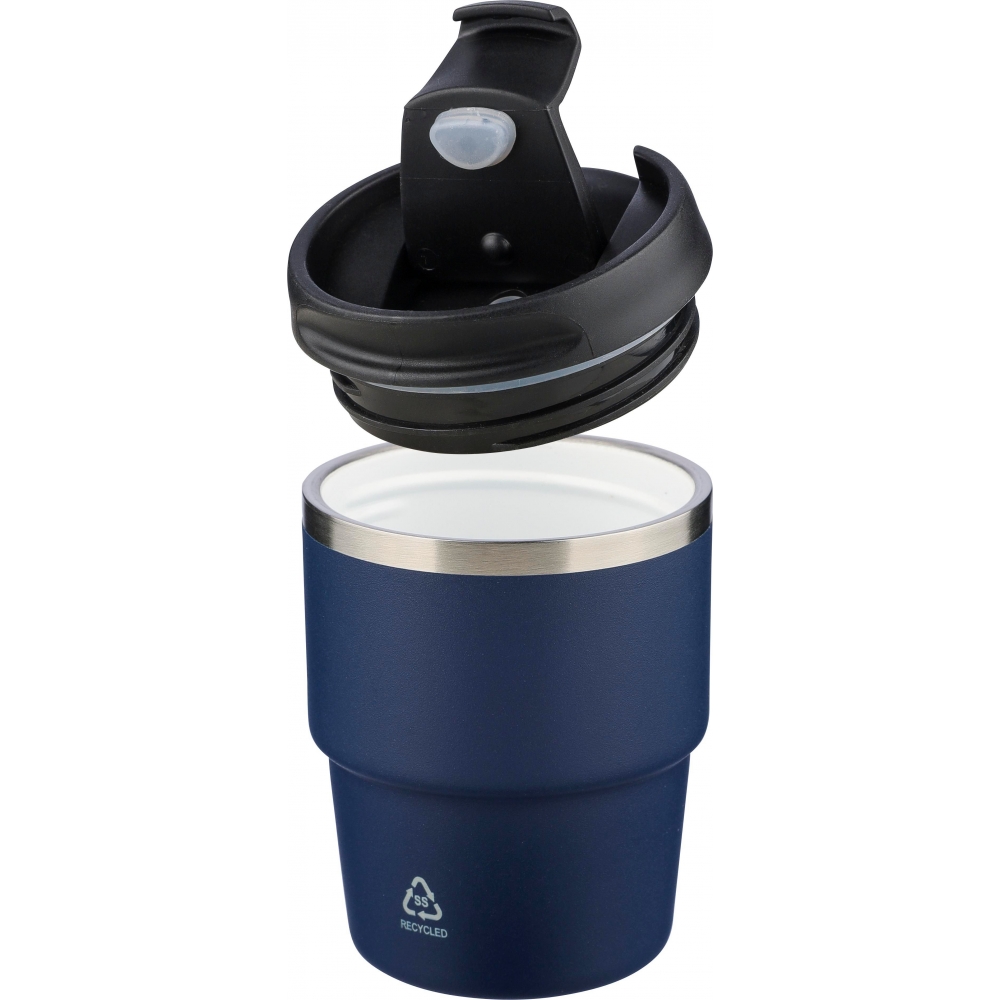Doppelwandiger Edelstahlbecher mit abnehmbarem Deckel. Boden antirutschbeschichtet. Füllmenge: 0,25 Liter.