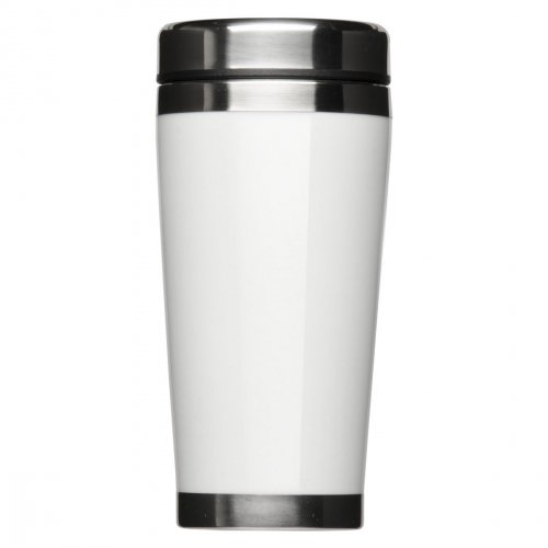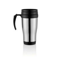 350ml Edelstahltasse, doppelwandig, außen und innen Edelstahl, mit Kunststoffgriff und Deckel. Farbe: silber Maße (cm): 12,5 x 17, ø 8,5 Gewicht (g): 311 Druckfläche (mm): 35 x 35