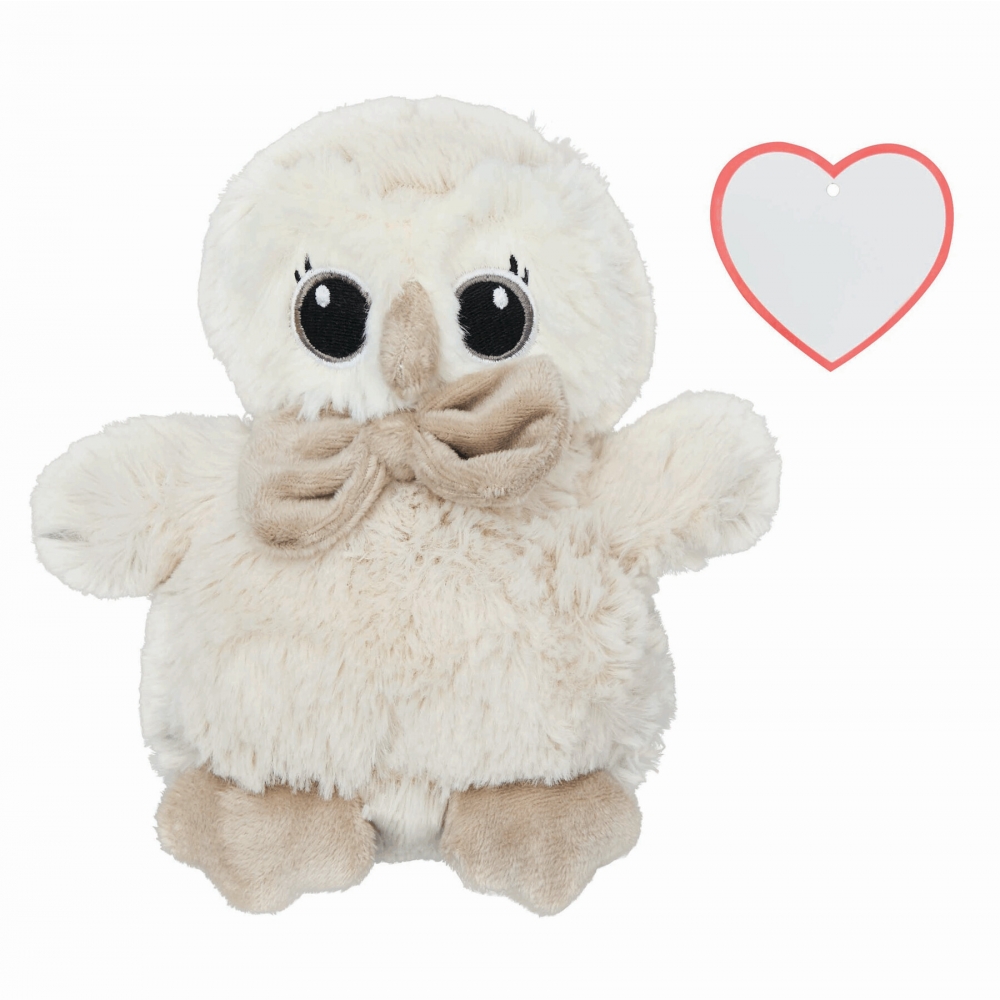 Artikel-Nr: INP56-0502066Plüsch-Eule HELGA: besonders weiches Fell – Ohren, Nase, Füße mit Stoff abgesetzt, mit Stoff-Fliege am Hals, mit Herzanhänger zum Bedrucken