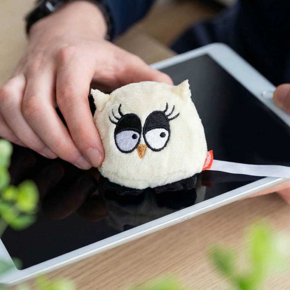 Mit ihren 7 cm Durchmesser liegen die kleinen, weichen Schmoozies® aus unserer Minifeet® Serie perfekt in der Hand. Doch die plüschigen Kuscheltiere können noch mehr als nur niedlich aus der Wäsche gucken: Mit einer Unterseite aus Mikrofaser eignen sie sich perfekt zur Reinigung glatter Oberflächen, wie z. B. Handydisplays oder Bildschirmen und zum Kuscheln und Schmusen sind sie auch perfekt geeignet. Die Werbeanbringung erfolgt auf einem Fähnchen, das an der Produktunterseite befestigt ist. Schmoozies® Eule, das weiche Kugeltier mit einer Unterseite aus Mikrofaser ist vielseitig einsetzbar.