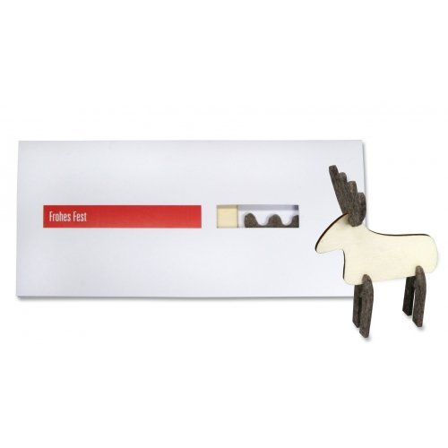 Artikel-Nr: 4012131680Zusammen basteln: Im Inneren der Karte liegen plano die Teile der jeweiligen Figur, die mit einfachen Handgriffen zusammengesteckt werden. Die Figuren bestehen aus Holz und Filz und sind als Elch, Baum, Stern, Engel, Nikolaus und Schaukelpferd erhältlich. Die Karte kann komplett individuell gestaltet werden (ein- oder beidseitig), oder Sie greifen auf die Standardgestaltung zurück. Größe: 10,5 x 21 cm, aufgeklappt 21 x 29,7 cm