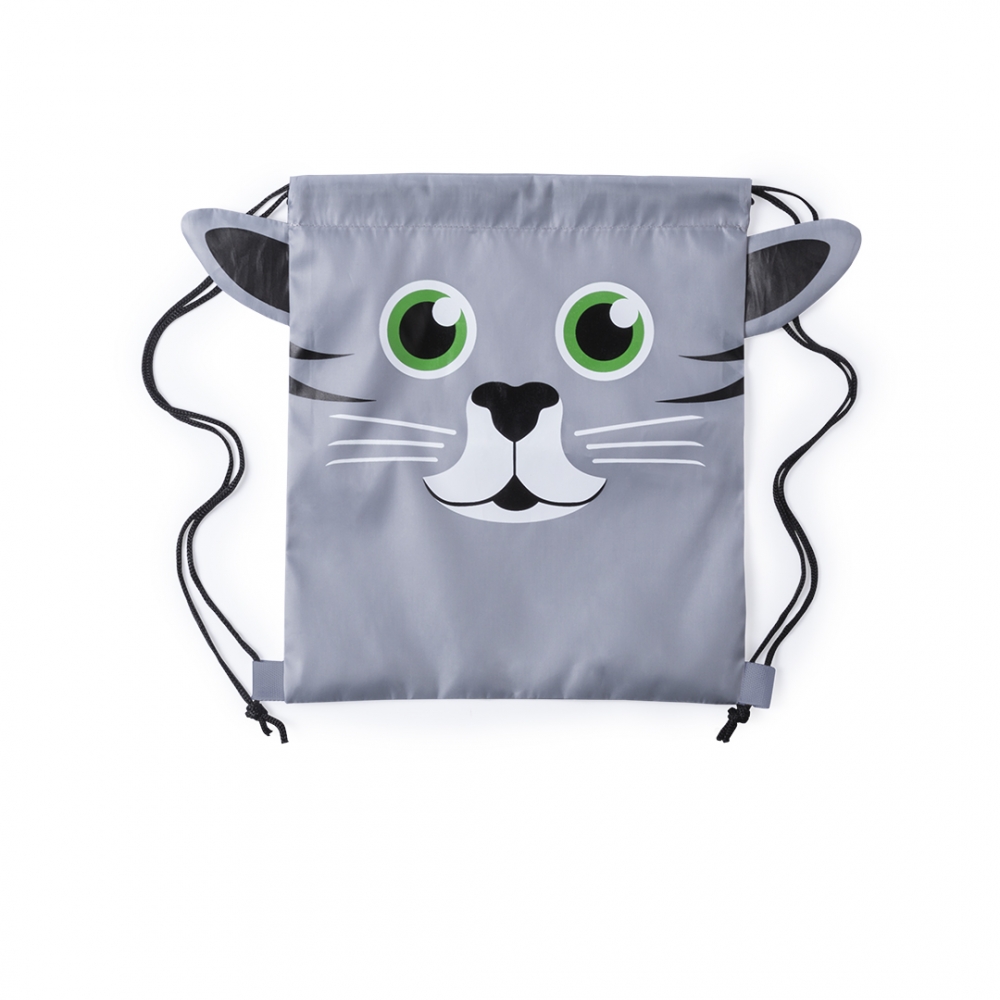 Faltbarer Rucksack mit Kordelzug für Kinder. Hergestellt aus weichem 210T Polyester mit originellen Tier-Designs. Mit Zugbändern in Schwarz und verstärkten Ecken. Faltbar auf kleine Größe.