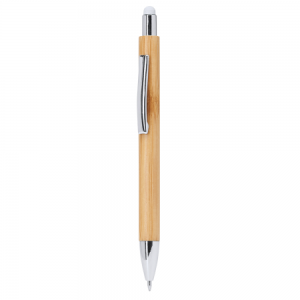 Eco-Line-Kugelschreiber mit Bambusgehäuse, farbigem Touchpointer und Metallclip. Silberner Druckknopf, Clip und Spitze. 1,0 mm transparente Jumbo-Mine mit blauer Tinte.