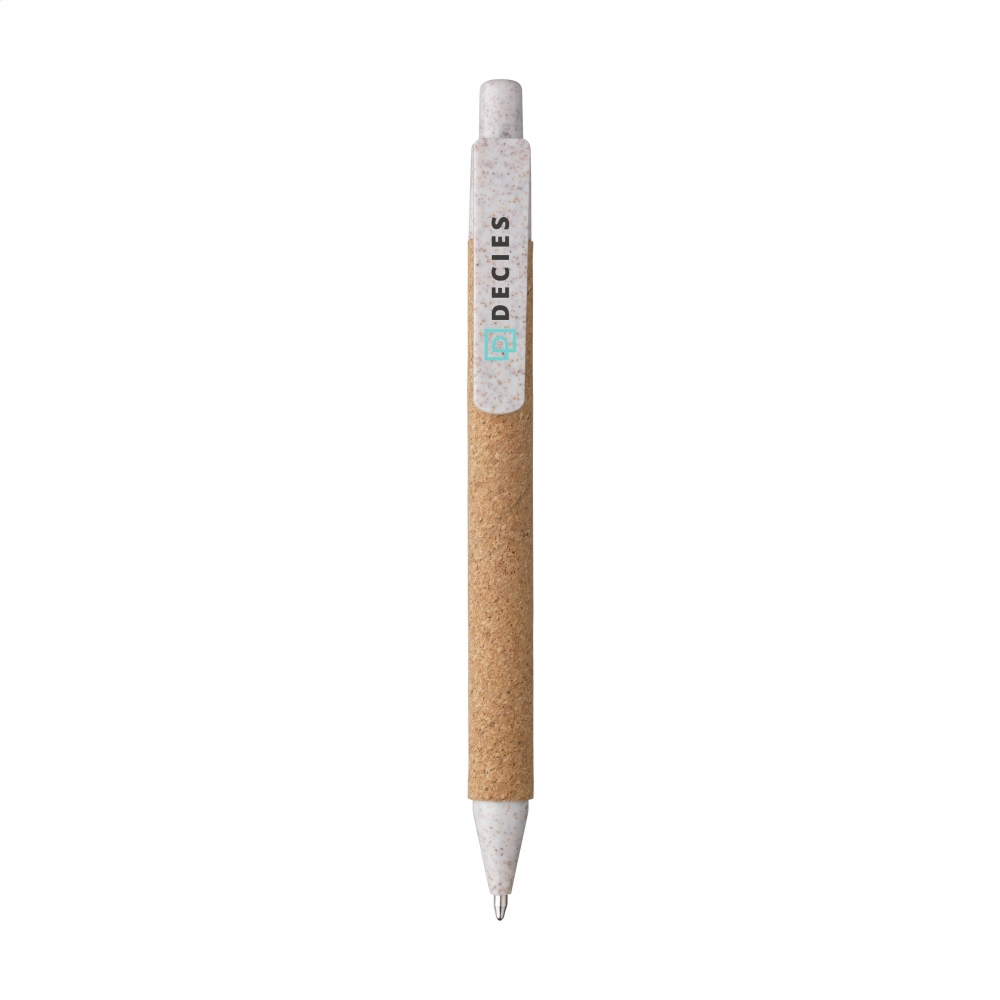 WoW! Blauschreibender Kugelschreiber mit Korkgehäuse. Die Spitze, die Oberseite, der Druckknopf und der Clip bestehen aus 50% PP und 50% Weizenstroh. Teilweise biologisch abbaubar.
