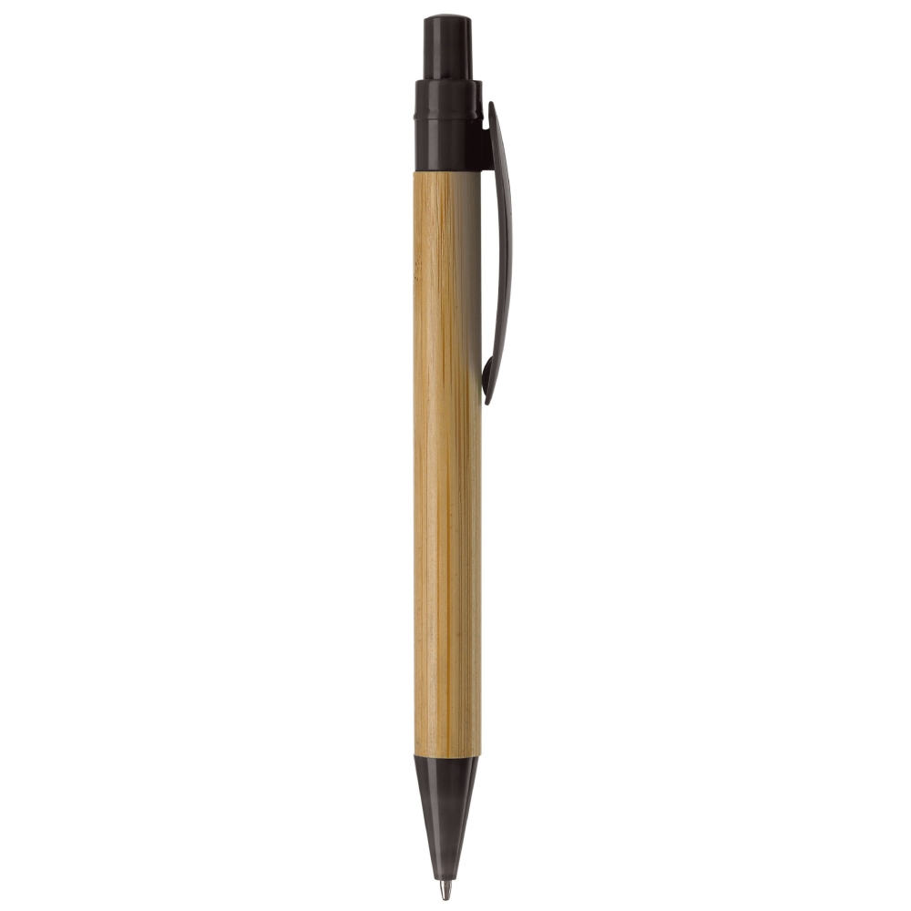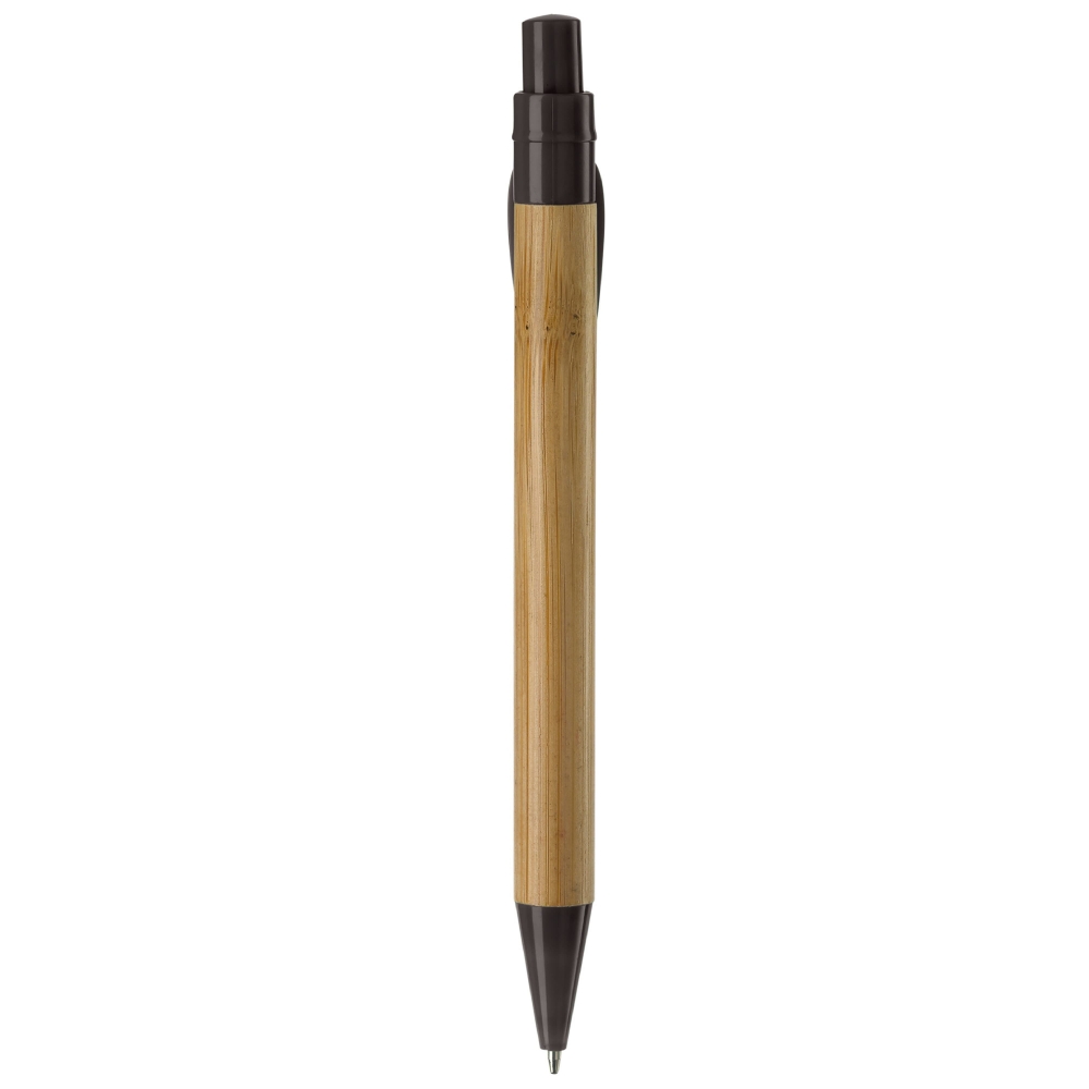 Bambuskugelschreiber mit Clip in Blattform. Farbiger Drücker und Unterteil, ausgestattet mit einer X20-Mine mit schwarzer Tinte. Bedruckung auf dem Clip möglich.