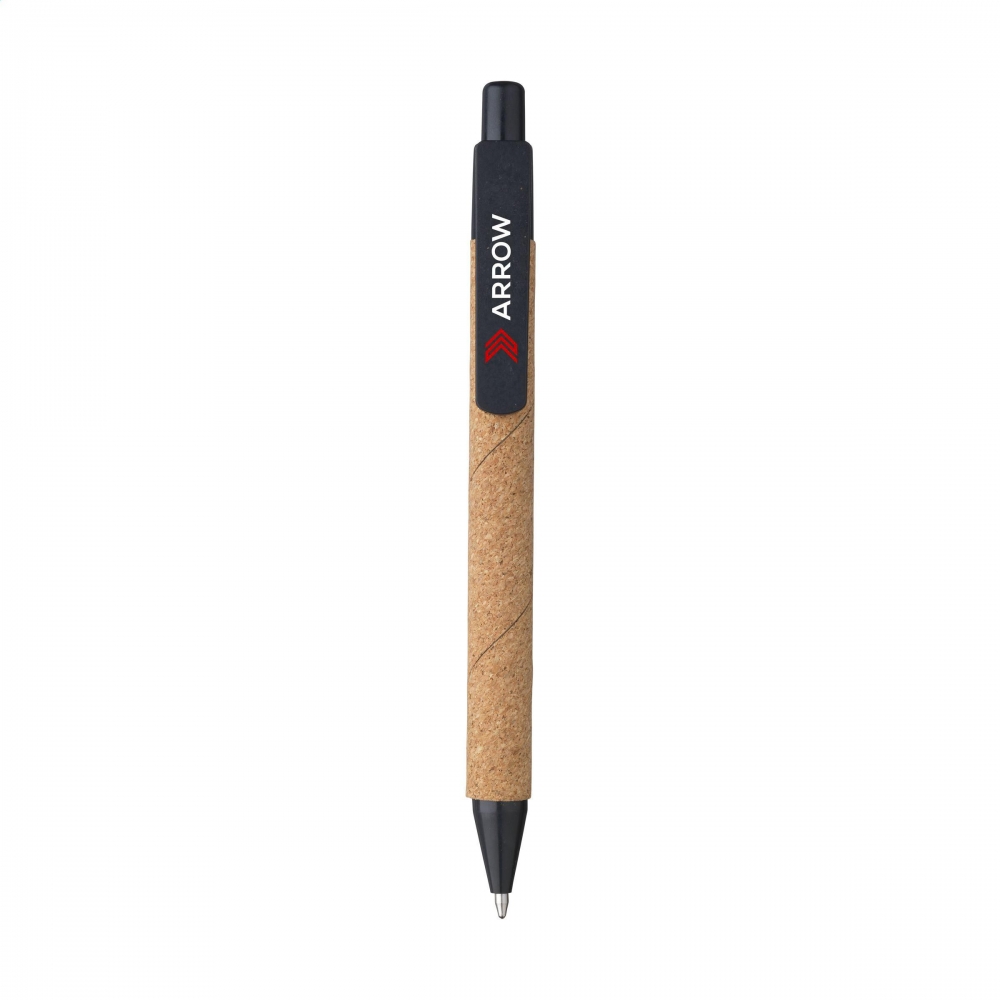 Blauschreibender Kugelschreiber mit Korkgehäuse. Die Spitze, die Oberseite, der Druckknopf und der Clip bestehen aus 50% PP und 50% Weizenstroh. Teilweise biologisch abbaubar.