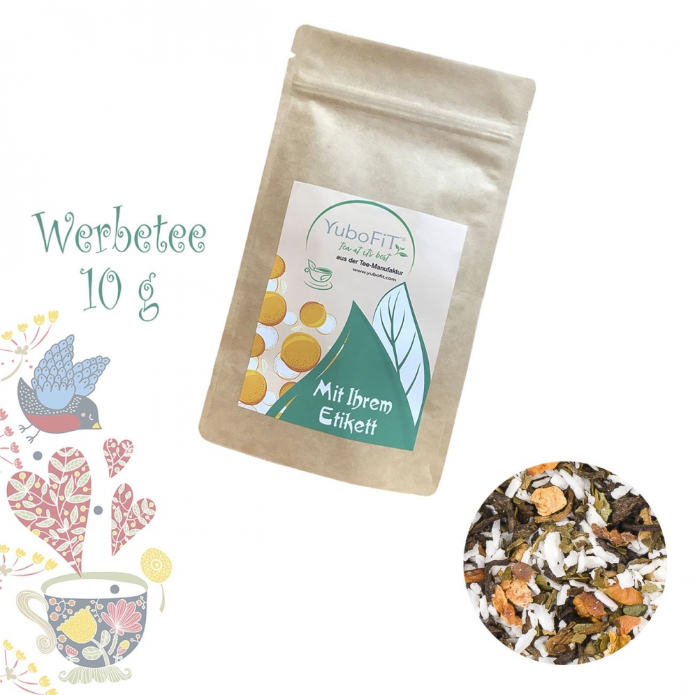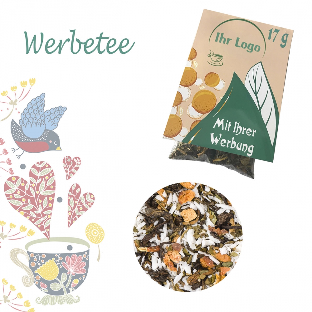 Artikel-Nr: HLSN60114728Tee als Werbegeschenk aus der YuboFiT® Tee Manufaktur. Der Geschmack nach Schokoladenkeks und cremiger Sahne mit einem feinen Röstaroma entführt Genießer ins Schlaraffenland