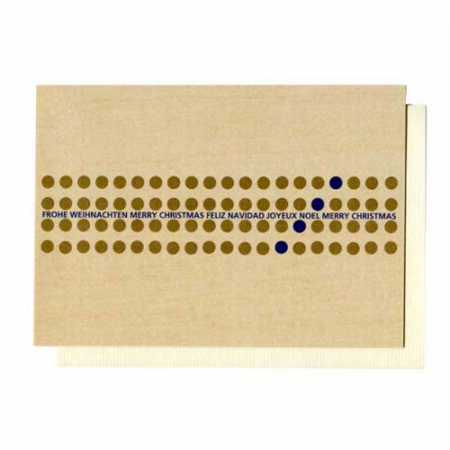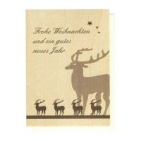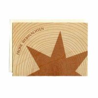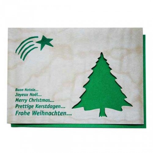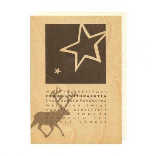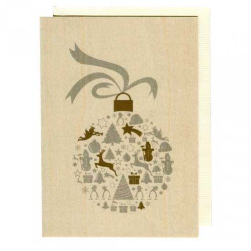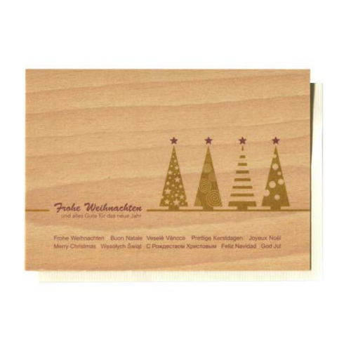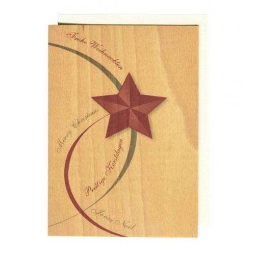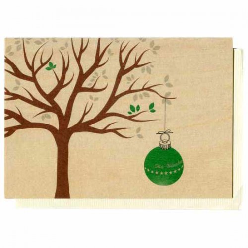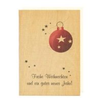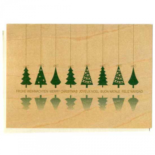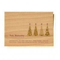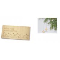 In dieser Weihnachtskarte aus Holz sind die Anhänger (Stern und Glocke) bereits vorgelasert und können ganz einfach rausgedrückt werden. An einem Faden aufgehängt, bilden sie einen schönen Blickfang in jedem Raum. Der Werbedruck erfolgt als Lasergravur auf dem Standardmotiv oder eine eigene Gestaltung der Holzkarte, jeweils ab 250 Stück. Ein Tampondruck auf der Holzkarte ist möglich. Ein Kuvert ist separat erhältlich Art. 6101 oder 6104.