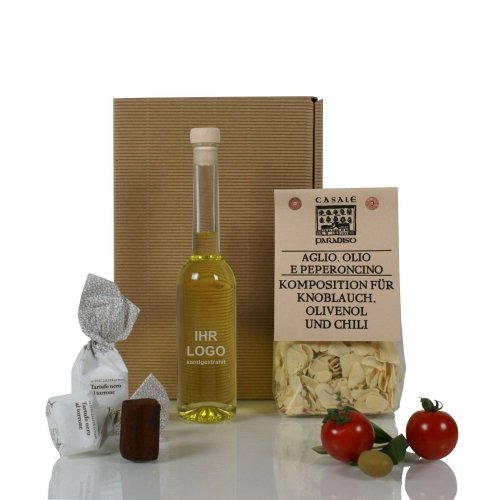 Artikel-Nr: A276K00972Präsentset bestehend aus einer köstlichen Gewürzmischung Aglio Olio, in Kombination mit einer schönen Schmuckflasche Opera, befüllt mit hochwertigem Olivenöl extra nativ. Abgerundet wird dieses Set durch zwei leckere Tartufo nero al torrone, welche für den süssen Feinschmeckergaumen in nachhaltiger Erinnerung bleiben. Werbemöglichkeit durch Veredelung der Schmuckflasche mit Ihrem Logo durch Sandstrahlung. Inhalt: Schmuckflasche Opera 0,1 l. - sandgestrahlt / Füllung Olivenöl nativ extra / 100 g. Aglio Olio Würzmischung / 2 x Tortufo nero al torrone a 18 g / Präsentkartonage mit Sizzle Pak.