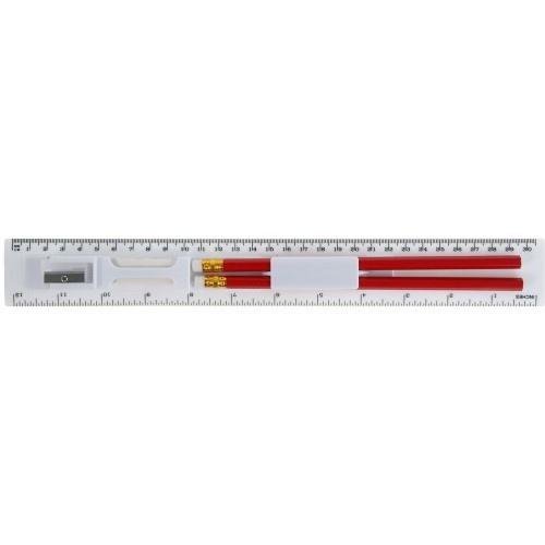 Set bestehend aus 3 angespitzten Bleistiften, 1 Anspitzer, 1 Radiergummi und 1 Holzlineal. Lieferung in einer Schachtel aus recyceltem Papier.