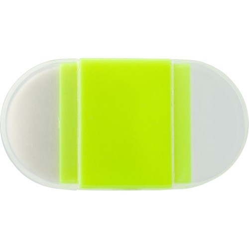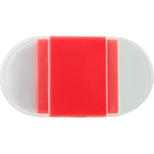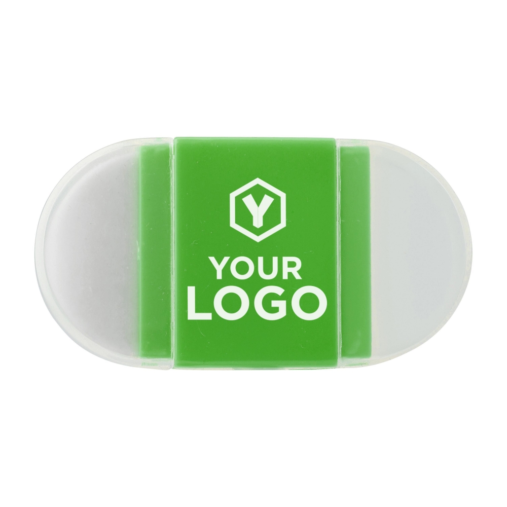 Bleistiftspitzer mit Radiergummi mit durchsichtigen Kappen auf beiden Seiten. Größe 6,2 x 3,3 x 1,6 cm.