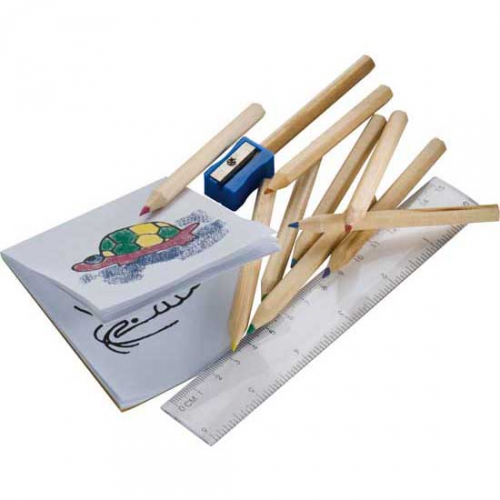 Malset bestehend aus 10 Buntstiften, Lineal (15 cm), Anspitzer und verschieden vorgedruckten Motiven zum Ausmalen. Ihre Werbung drucken wir auf den Pappkarton.